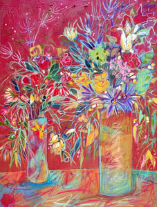 "Celebration In Red with Two Vases" Mixed Media Painting